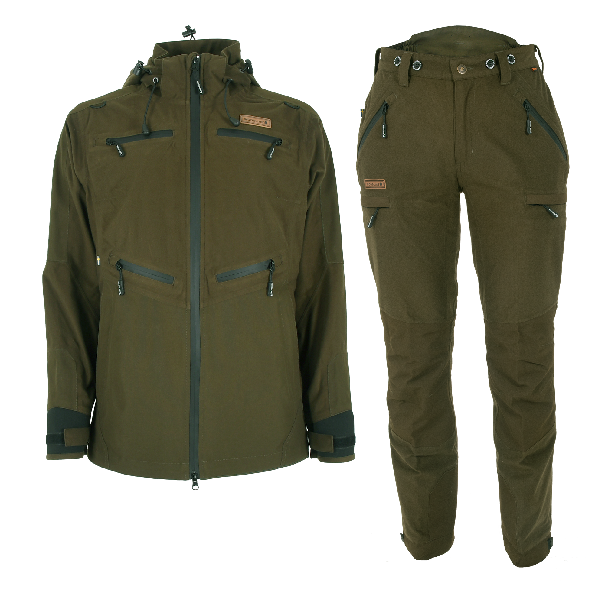 Ett tyst och lätt jaktställ utrustat med M-Tec funktionsmaterial vilket gör det vind- och vattentätt. Jackan är justerbar nedtill och i kragen med dragsnöre för bästa passform.