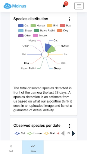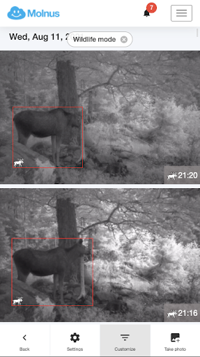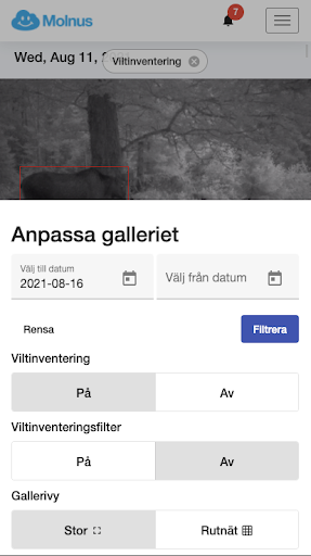 Viltinventeringen i Molnus ger dig en uppskattning om vad för djur som har fastnat på bild. Lösningen baserar sig på en AI som läser av varje bild och försöker identifiera om något djur är i bild och vad det i så fall är för art. Om AI är 90% eller mer säker på vad det är den ser i bilden visar Molnus gissningen i appen via en ikon i nedre högra hörnet på bilden, och om viltinventeringsläget är påslaget visas även en röd box i bilden där djuret är identifierat. Om säkerheten på gissningen är under 90% så visas istället en frågeteckensikon, det betyder att det med säkerhet finns något i det markerade området men att det inte kunde fastställas vad det är. (AI är en inbyggd maskinintelligens som ständigt utvecklas och uppdaterar sin kunskap efter hand och på så vis blir smartare och bättre ju mer den jobbar. Om AI:n föreslår ett felaktigt förslag som du korrigerar har du hjälpt till att utöka dess kunskap, och framtida förslag kommer bli bättre och bättre).
