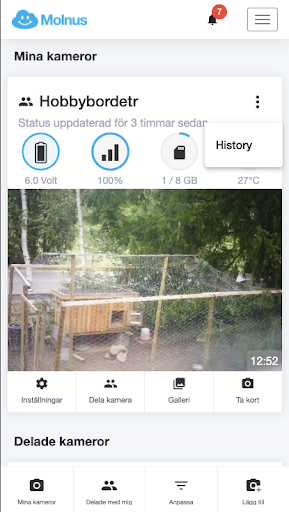 På varje kamera i kameralistan kan du nu nå en ny sida för kamerahistorik. På denna sida presenteras historisk data för kameran i grafer som visualiserar kamerans beteende och status. I dagsläget visas data för de senaste 28 dagarna. För varje graf kan du också välja att ladda ned den underliggande datan som en .csv fil för användande i andra program. För att ladda ned datan tryck på knappen med tre prickar uppe i högra hörnet på varje graf och välj ”Exportera”, filen laddas då ned till mobilens ”Download” folder.