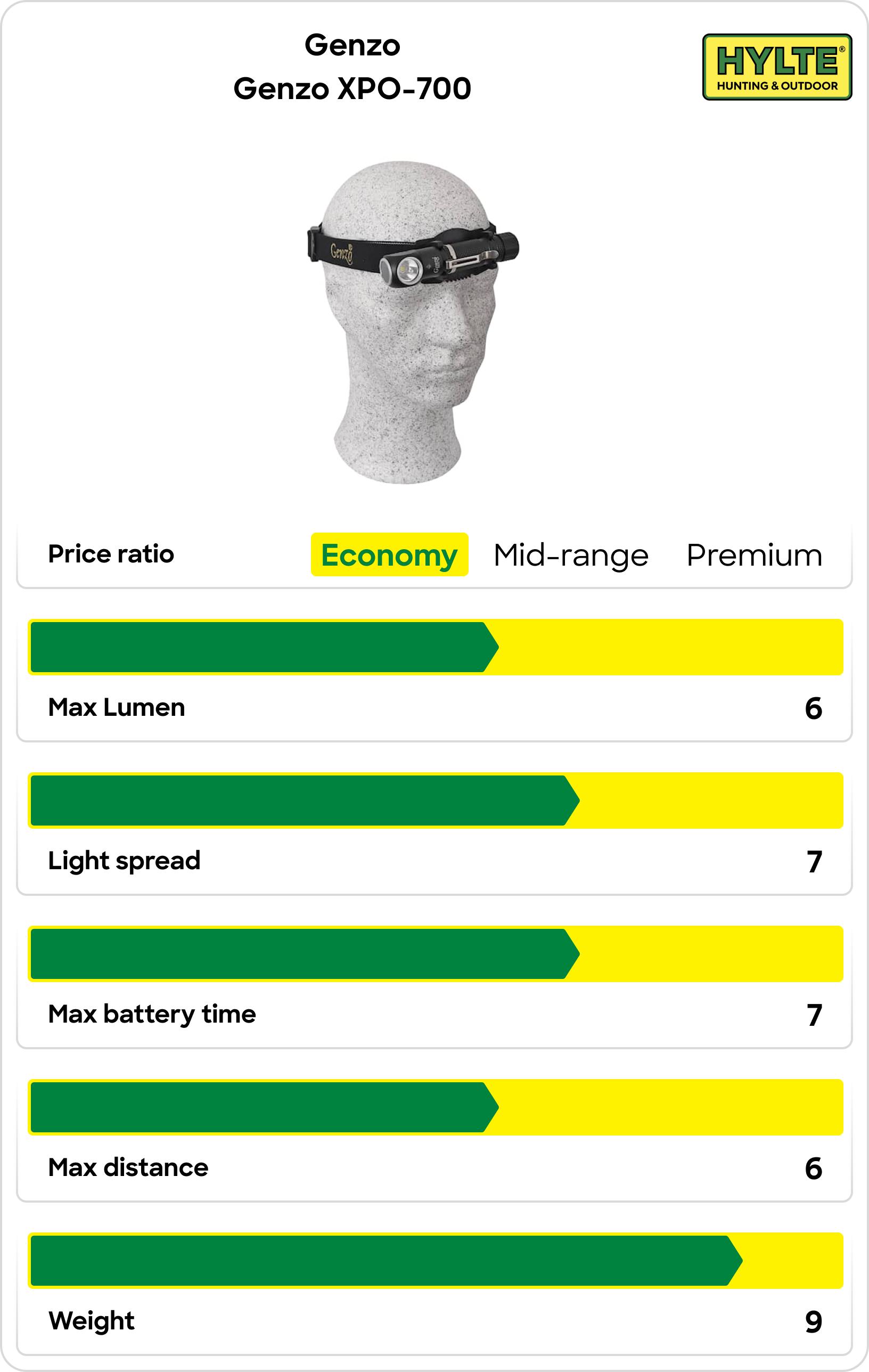 Letar du efter en kraftfull men relativt smidig lampa med brett synfält så är detta ett intressant val. Bra för hundpromenader eller enklare eftersök. Kanske lite i största laget för en passkytt men smidig nog för vakjakt efter gris eller ridning. Batteriet är oskyddat så att batteritiden borde påverkas vid starkare kyla, något som även tillverkaren är transparent med. Batteritiden varierar mellan 40 min och 100 min i max mode beroende på temperatur. Den ger inte riktigt samma ljusbild som M-Tiger eller erbjuder ett så prisvärt erbjudande som Genzo XPO-700, men du får en bred och fin ljusbild i ett större område.