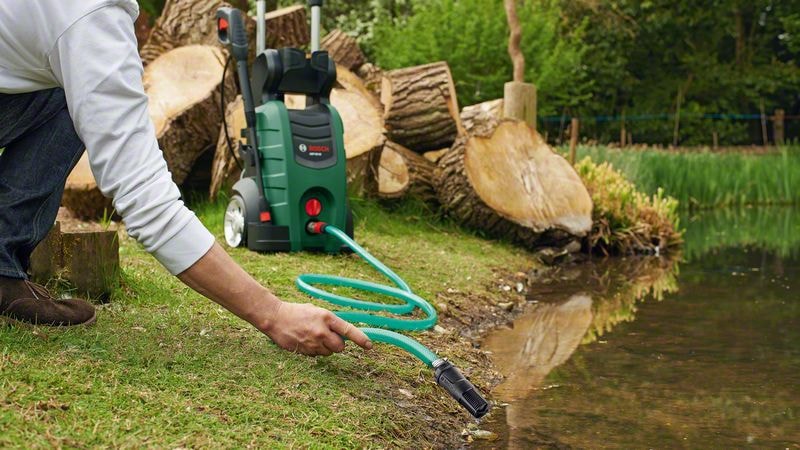 Med självpumpningssatsen behövs ingen kran. Vatten kan enkelt tas från andra källor, som regntunnor, vilket ger större flexibilitet vid rengöring utanför huset eller på andra platser. Med hjälp av en 3 m slang kan vatten matas in i alla högtryckstvättar i serien Bosch Aquatak. En sil på slangen förhindrar att partiklar hamnar i högtryckstvätten, så vatten från öppna källor kan också användas.