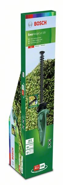 EasyHedgeCut 18-45 är perfekt för upprätthållning och trimning av små och mellanstora häckar. Den är med sina 2,3 kg mycket lätt och har en ergonomisk utformning för komfortabel hantering i olika arbetslägen, för minskad belastning på överkroppen vid arbeten under längre tid. 18V litiumjonbatteri ger optimal kraft i kombination med Bosch antinypsystem för lysande förhållande för rena, kraftfulla och kontinuerliga klipp utan frustrerande avbrott till följd av exempelvis nypning. Sladdlös mobilitet för rörelsefrihet i trädgården, utan begränsning eller risk att man klipper av strömsladdar. Verktyget ingår i POWER FOR ALL ALLIANCE. Ett batteri kan användas i en stor mängd verktyg från olika märken.