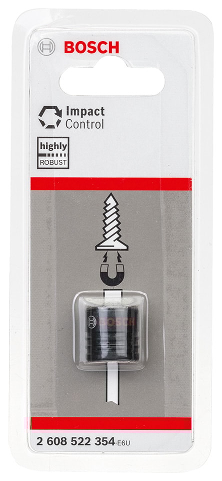 Magnethylsan håller skruv i borr. Hylsan har en magnetring som glider över de dubbeländade Impact Control-borrspetsarna. Detta gör att skruvarna sitter säkert i borren i ett magnetgrepp för stadig skruvdragning.