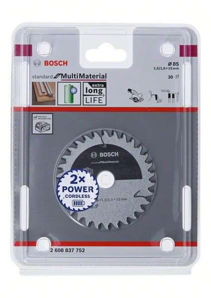 Standard for Multi Material cirkelsågklinga maximerar batteritiden för sladdlösa sågar. Den extra tunna skränkningen minskar friktionen och materialborttagning, som ger lägre energiförbrukning och smidigare sågning. Hårdmetalltänder av hög kvalitet ger rena och exakta resultat. Den lämpar sig för kapning av laminatgolv, järnfri metall, aluminium, plast, epoxi och trä. Standard for Multi Material cirkelsågklinga ger rena och exakta snittresultat tack vare dess hårdmetalltänder av hög kvalitet. Expansionsslitsar minskar buller och värme markant under arbetet. Klingan passar alla vanliga sladdlösa handsågar.