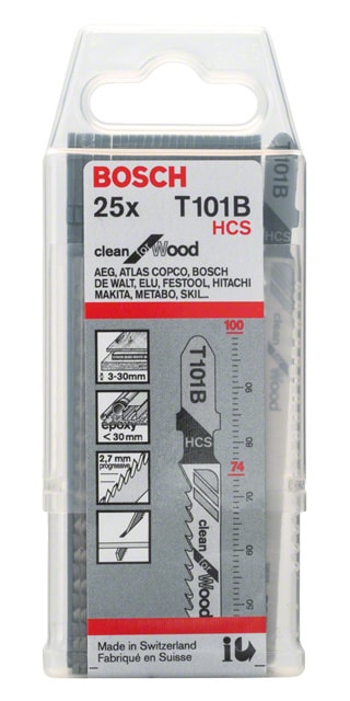 För användning med sticksågar med T-skaftsystem för fasthållning. T 101 B Clean for Wood sticksågblad gör rena, raka snitt i trä. Dess precisionsslipade tänder med dubbelkonisk kropp borgar för snyggt resultat. Bladet är tillverkat av stål med hög kolhalt, vilket är lämpligt för sågning i mjuka träslag och ej slipande trämaterial. Det har progressiv, fin tandutformning (2,7 mm) för sågning i trämaterial med tjockleken 3–30 mm.
