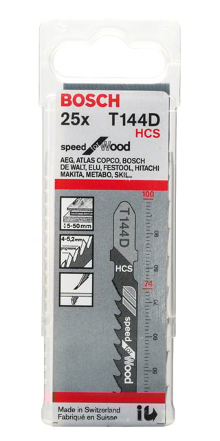 För användning med sticksågar med T-skaftsystem för fasthållning. T 144 D Speed for Wood sticksågblad gör snabba, raka snitt i trä. Dess skarpslipade tänder med sidotandning möjliggör snabbt resultat. Bladmaterialet – stål med hög kolhalt – är lämpligt för mjuka träslag och ej slipande trämaterial. Dessutom möjliggör bladets progressiva, stora tandutformning (4–5,2 mm) sågning i ett flertal olika trämaterial med tjockleken 5–50 mm.