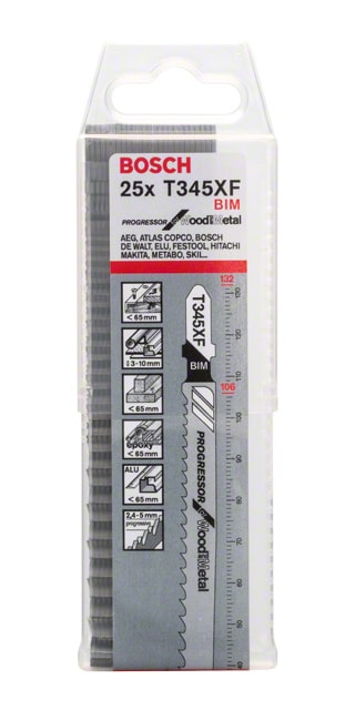 För användning med sticksågar med T-skaftsystem för fasthållning. T 345 XF Progressor for Wood and Metal sticksågblad gör snabba, raka snitt i tjockt och tunt trä med metall. Dess tandgeometri med progressivt ökande tanddelning medger bearbetning av material med vitt skilda densiteter. Vidare är bladets valsade sidotandning utformad för snabba snitt. Dess fullt härdade tandrad av HSS (snabbstål) är hopfogad med dess kropp av högelastiskt HCS (stål med hög kolhalt) till en bimetall, som gör att bladet lämpar sig för att såga metallinkapslat trä med stålkomponenter av standardhållfasthet. Det har progressiv, stor tanddelning (2,4–5 mm) och rejäl längd (132 mm), och kan såga flera sorters metallinkapslat trä med tjocklek upp till 65 mm, exempelvis ej härdade spikar, skruvar och fästanordningar.