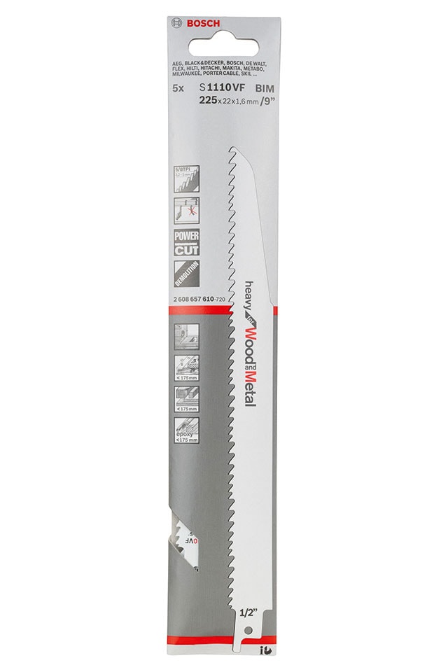 För användning med tigersågar med ett universalskaftsystem på 1/2 tum. S 1110 VF Heavy for Wood and Metal tigersågblad sågar snabbt i trä och metall. Bladet har en bred, avsmalnade kropp (22 mm) och extratjockt material (1,6 mm) som ger den optimala stabilitet som är nödvändig vid rivningsarbeten. Det sågar kontrollerat och rakt utan risk för böjning. Dess Vario-tandutformning och stora spånrum transporterar effektivt bort material och snabbar upp arbetet. Bladets fullt härdade tandrad av HSS (snabbstål) är hopfogad med bladet av högelastiskt HCS (stål med hög kolhalt) till en bimetall, som gör bladet perfekt för att såga i medelhållfast stål inkapslat i trä. Bladet har en standardlängd på 225 mm för en skärförmåga upp till 175 mm.