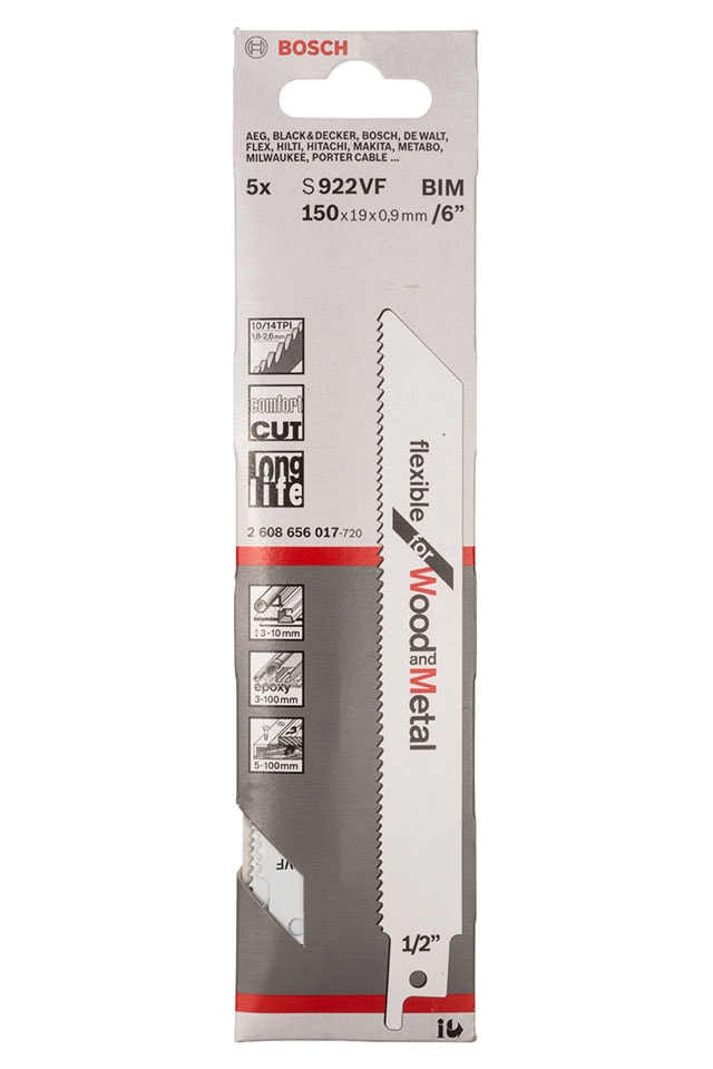 Det har ett 1/2-tums universalskaft. S 922 VF Flexible for Wood and Metal tigersågblad sågar jämt i trä och metall utan ansträngning. Vario-tandgeometrin (1,8/2,6 mm) gör sågningen jämn och vibrationsreducerad. Vidare är BIM-bladet (bimetall) optimerat för sågning genom mjuka spikar, mjukt stål och järnfri metall i trä. Detta tigersågblad har en standardlängd (150 mm) som ger en skärförmåga på upp till 100 mm.