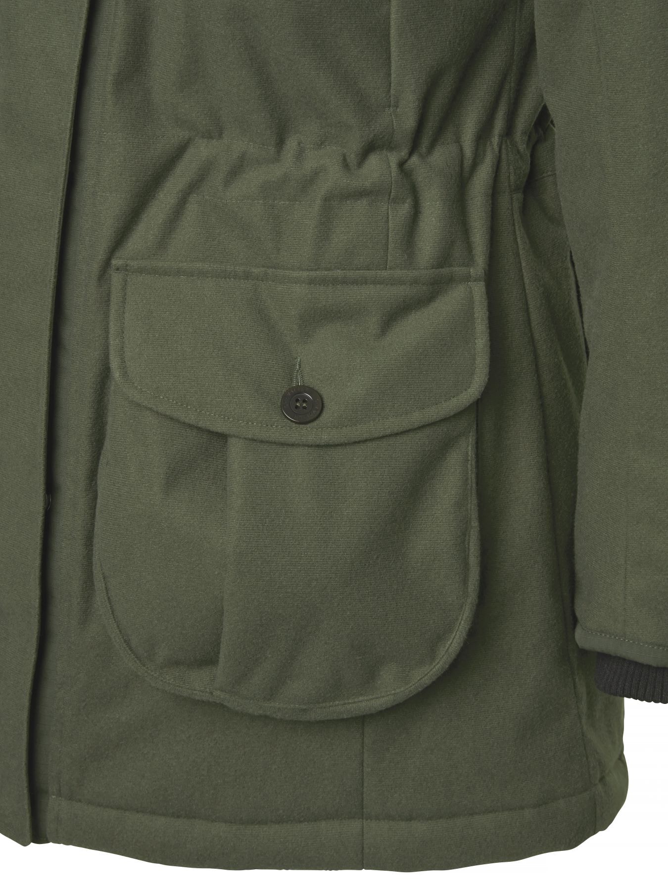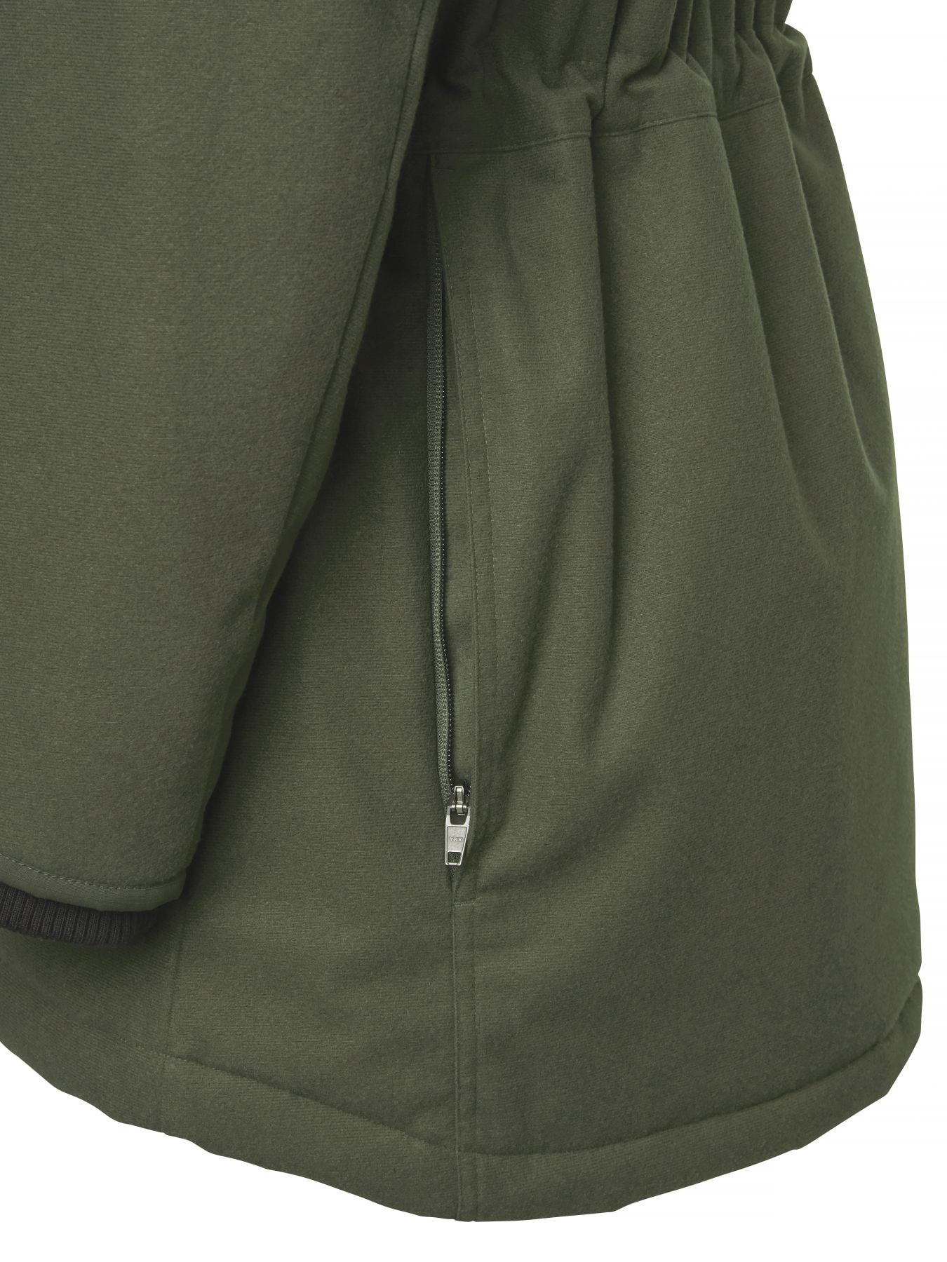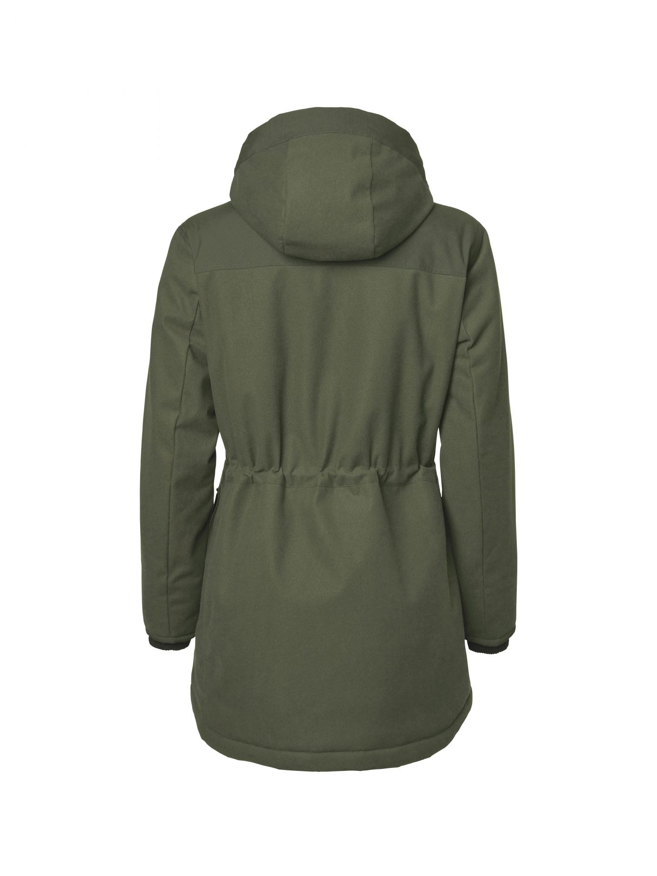 Frost jacket är vår varmaste jaktjacka för dam. Den har en feminin passform och är kraftigt vadderad och gjord för de kallare jaktdagarna och passjakten. Plagget är tillverkat i ett vattentätt och mjukt borstat yttertyg av återvunnen polyester och har förstärkningar av Cordura® ripstop på axelpartiet. De dubbla kragarna håller ute vind och kyla och gör att du kan boa in dig i jackan när du sitter på passet. Den yttre kragen är extra hög och den inre mjuk, vadderad och omslutande. Jackan har dubbla radiofickor, hängfickor, stora bälgfickor, dubbel, bakficka och napoleonficka med säkerhetsficka på insidan. Frost har dubbel knappslå fram med tryckknappar. De avtagbara hängslena som sitter på insidan gör att du kan hänga jackan över axlarna som en ryggsäck om du blir för varm. En extra finess är en sittlapp som är fäst på insidan och som du kan fälla ner. I den kan du lägga ditt sittunderlag. Jackan är justerbar i midjan. Frost jacka och byxa blir ett riktigt varmt och användbart jaktställ.