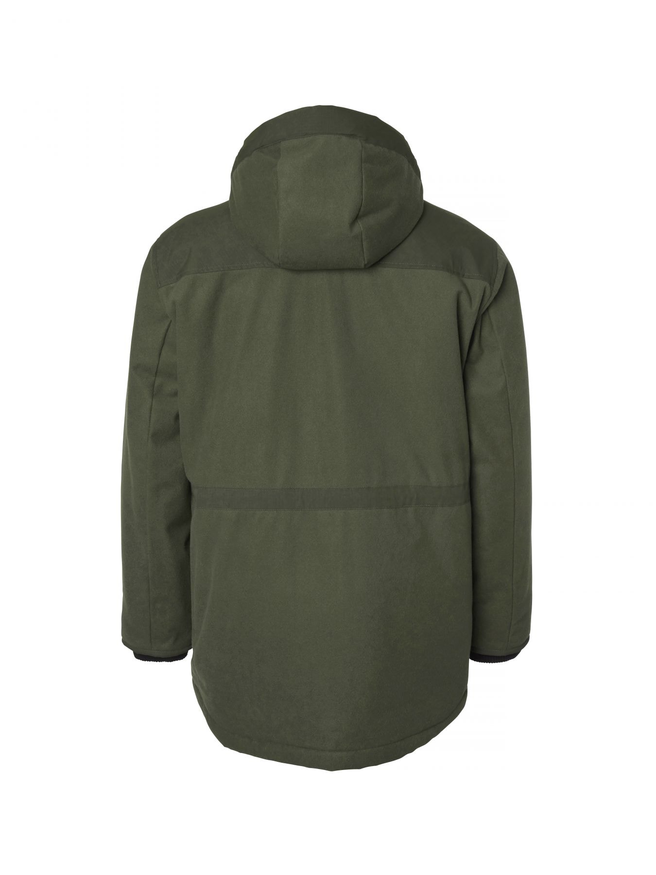 Frost jacket vår varmaste jaktjacka. Den är kraftigt vadderad och gjord för de kallare jaktdagarna och passjakten. Plagget är tillverkat i mjukt borstat yttertyg av återvunnen polyester och har förstärkningar av Cordura® ripstop på axelpartiet. De dubbla kragarna håller ute vind och kyla och gör att du kan boa in dig i jackan när du sitter på passet. Den yttre kragen är extra hög och den inre mjuk, vadderad och omslutande. Jackan har dubbla radiofickor, hängfickor, stora bälgfickor, bakficka och napoleonficka med säkerhetsficka på insidan. Frost har dubbel knappslå fram med tryckknappar. På insidan finnas avtagbara hängslen som gör att du kan hänga jackan som en ryggsäck över axlarna om du blir för varm. En extra finess är en sittlapp som är fäst på insidan och som du kan fälla ner. I den kan du lägga ditt sittunderlag. Jackan är justerbar i midjan. Frost jacka och byxa blir tillsammans vårt varmaste och mycket användbara jaktställ.