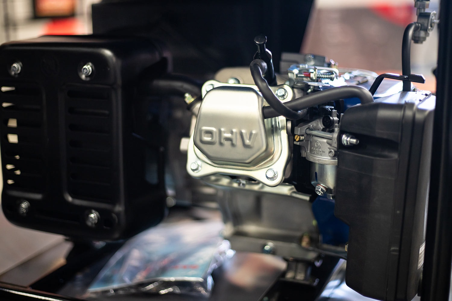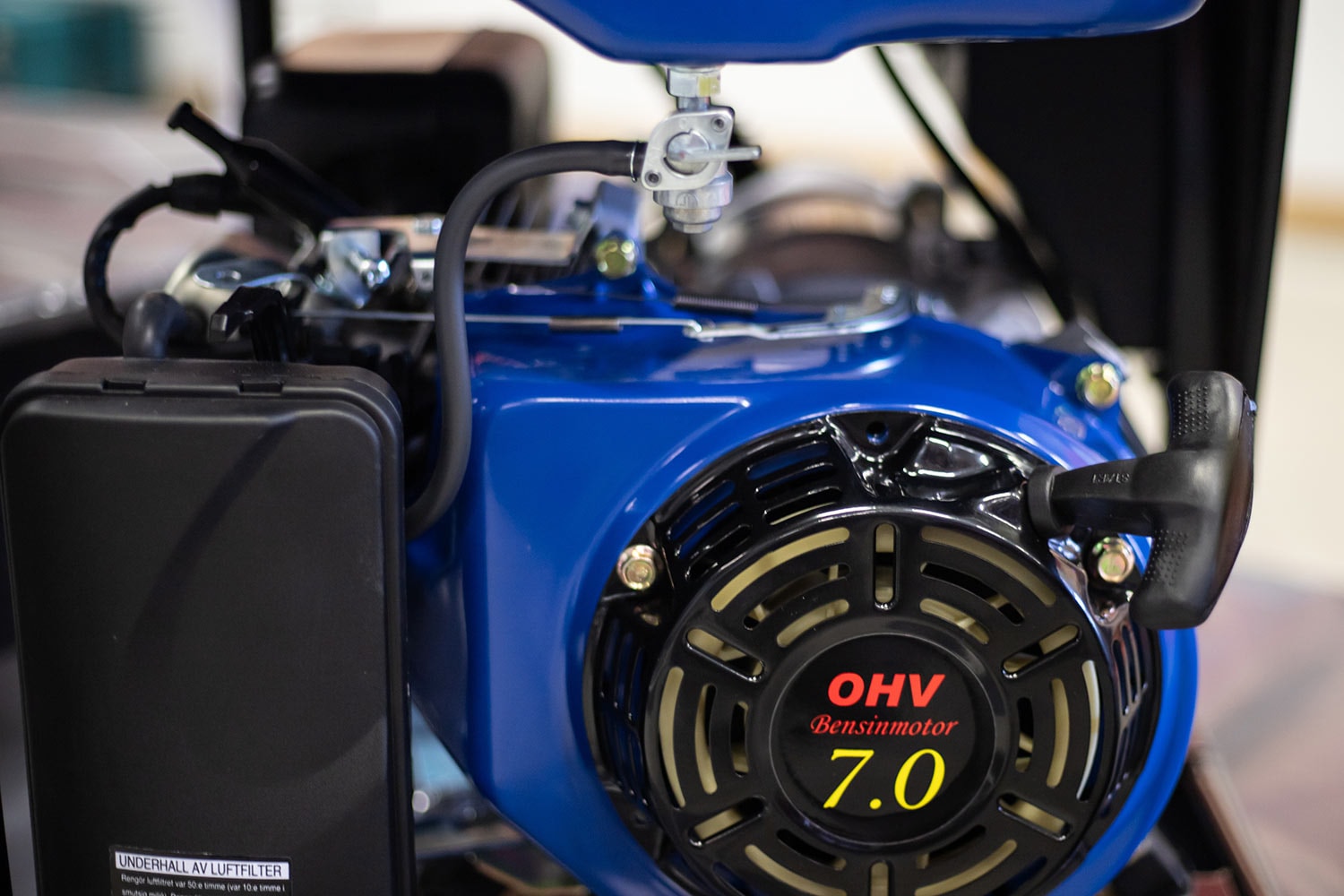 Driftsäker handstartad motor på hela 6,5 hk av fabrikat Mellga försedd med oljenivåvakt och bränslenivåindikering. Drivs på blyfri bensin 95 oktan.