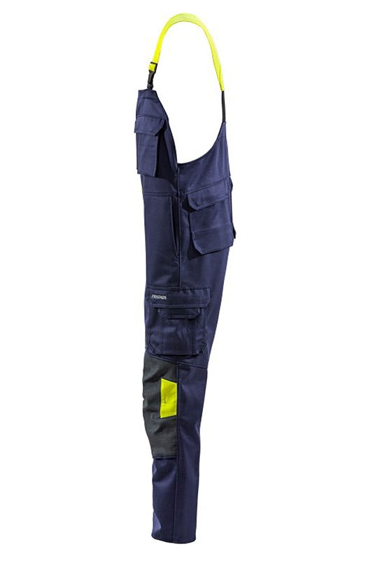 Flamskyddade hängslebyxor som är godkända för tung svetsning klass 2. Slitstarka och antistatiska svetsbyxor med bekväm bomullskänsla som har ett brett multinorm-skydd. Extra högt skydd mot smält metall och svetsloppor.