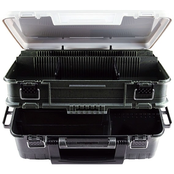 Meiho/Versus Tacklebox Black är tillverkad i en slitstark plast och är utrustad med ett kraftigt bärhandtag. Det övre facket har 3 st fasta fack som kan delas av med totalt 11 st avdelare. I bottenfacket finns 3 st löstagbara avdelare med möjlighet att hänga upp spinnerbaits (djup ca 12 cm). Bottenfacket har även 4 st mer öppna fack där 1 avdelare är fast och 2 st avdelare är löstagbara.