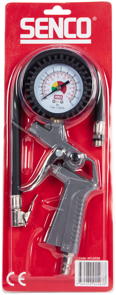 Luftpåfyllare med manometer som ansluts till kompressor. För påfyllning och kontroll av lufttryck i bildäck och cykel med bilventil.